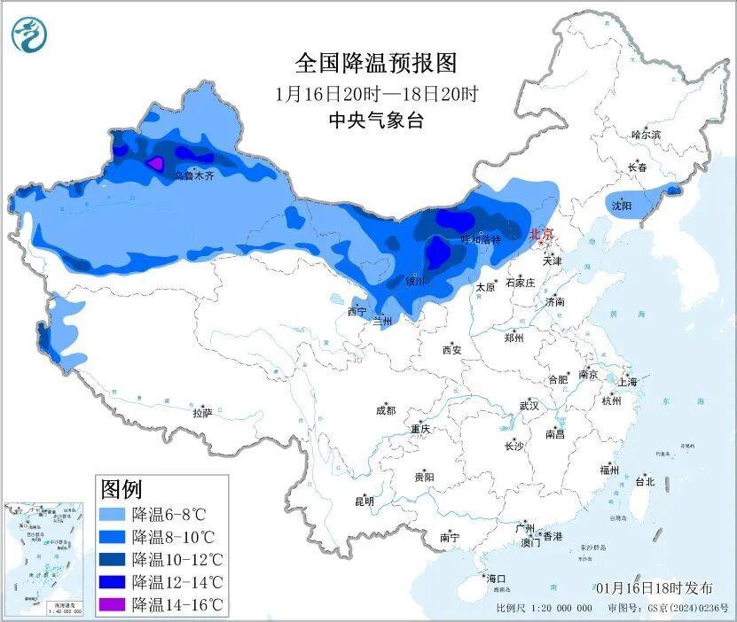 预计,1月16日20时至18日20时,新疆、甘肃、内蒙古中西部、宁夏、陕西北部、华北北部等地气温下降6到10℃,其中,新疆伊犁河谷及沿天山一带地区、内蒙古中部等地局地降温可达10到14℃。