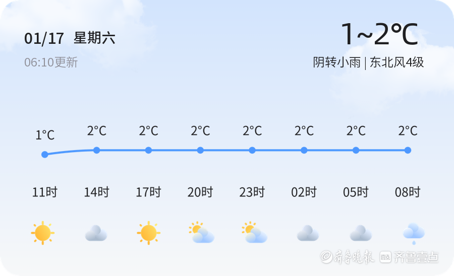 今天是2026年1月17日,农历十一月廿九,星期六。临沂市今日天气阴转小雨,气温在1℃至2℃之间,东北风4级,空气湿度为70%,PM2.5浓度为33。各区天气情况总体平稳,但雨天路滑,市民出行需注意安全。