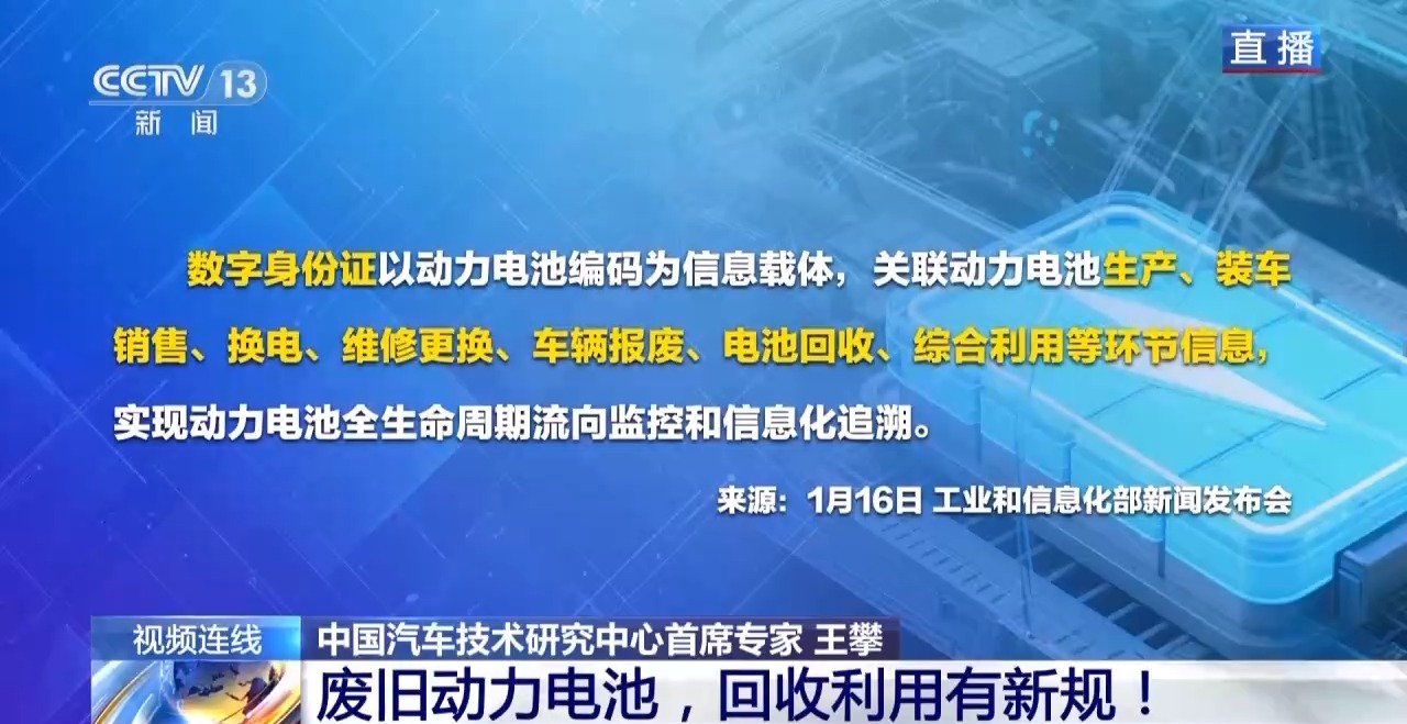 工业和信息化部节能与综合利用司司长 王鹏:具体来说,数字身份证以动力电池编码为信息载体,关联动力电池生产、装车销售、换电、维修更换、车辆报废、电池回收、综合利用等环节信息,实现动力电池全生命周期流向监控和信息化追溯。可以说,将数字技术应用于动力电池全流程溯源管理是《管理办法》的一项重要制度创新。