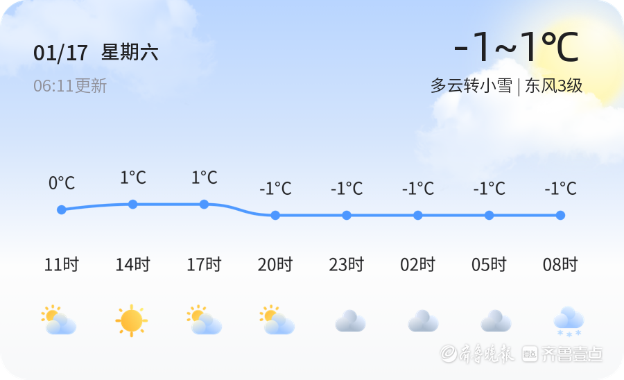 今天是1月17日,星期六,农历十一月廿九。德州市迎来多云转小雪的天气,气温在-3.9度左右,东风3级,空气湿度78%,PM2.5指数为44,空气质量良好。全市各区天气情况基本一致,均为多云转小雪,气温较低,市民出行需注意保暖。