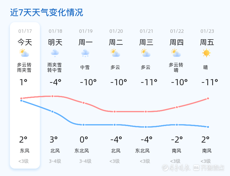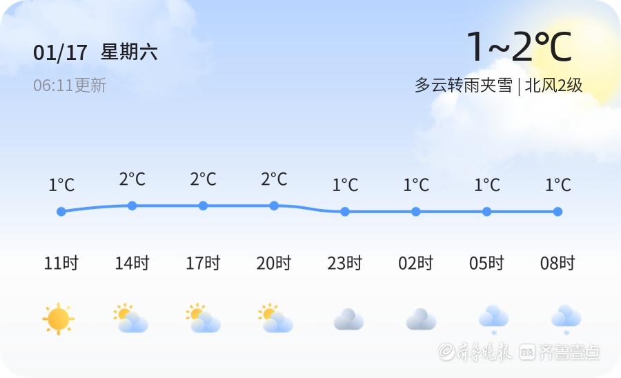 今日是2026年1月17日,星期六,农历十一月廿九。菏泽市今日天气多云转雨夹雪,北风2级,空气湿度84%,PM2.5指数70。全市各区的天气情况基本一致,最高气温2℃,最低气温1℃,目前温度为-3.5℃。市民出行需注意防寒保暖,携带雨具以应对雨夹雪天气。