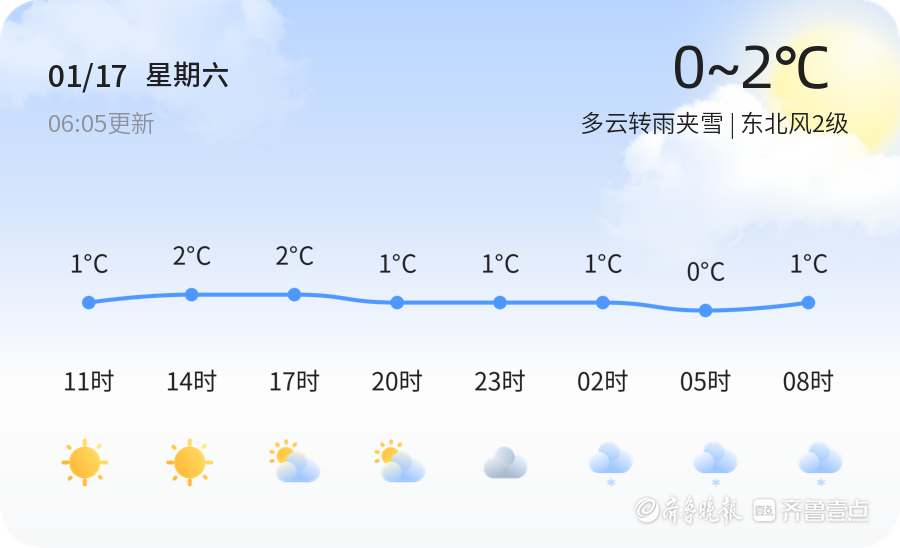 今日是1月17日,星期六,农历十一月廿九云转雨夹雪,气温在0℃至2℃之间,东北风2级,空气湿度为69%,空气质量良好(PM2.5为46)。当前温度为-3.5℃,雨雪天气可能导致路面湿滑,市民出行请注意安全,建议选择合适的交通工具并及时添衣保暖。