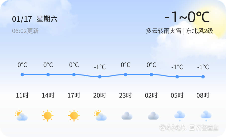 今天是2026年1月17日,星期六,农历十一月廿九。东营市今天天气多云转雨夹雪,温度在-3.2℃左右,东北风2级,空气湿度65%,PM2.5指数为26,空气质量良好。市民在出行时请注意保暖,雨雪天气可能导致路面湿滑,建议驾驶车辆时保持车距,减速慢行。
