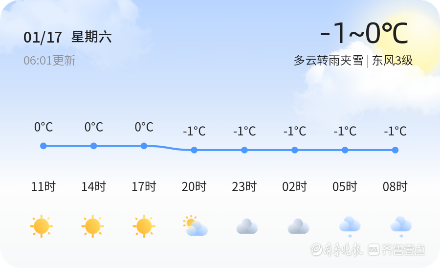今天是2026年1月17日,星期六,农历十一月廿九。淄博市今日天气多云转雨夹雪,气温-1.7℃,东风3级,空气湿度61%,空气质量优(PM2.5为41)。今日的雨夹雪天气可能对市民出行造成一定影响,建议市民出行时注意防滑,谨慎驾驶,尤其是早晨和傍晚时段,道路可能湿滑,需特别小心。