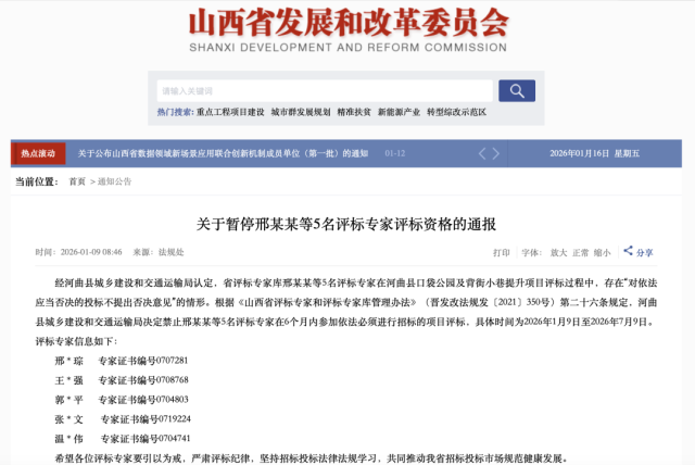 9日,山西省发改委还通报了暂停邢某某等5名评标专家评标资格的消息。