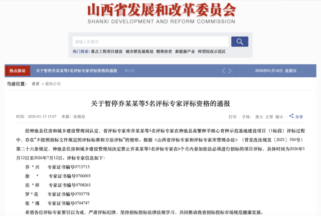 1月15日,山西省发改委发布通报称,经神池县住房和城乡建设管理局认定,省评标专家库乔某某等5名评标专家在神池县高繁种羊核心育种示范基地建设项目(1标段)评标过程中,存在“不按照招标文件规定的评标标准和方法评标”的情形。