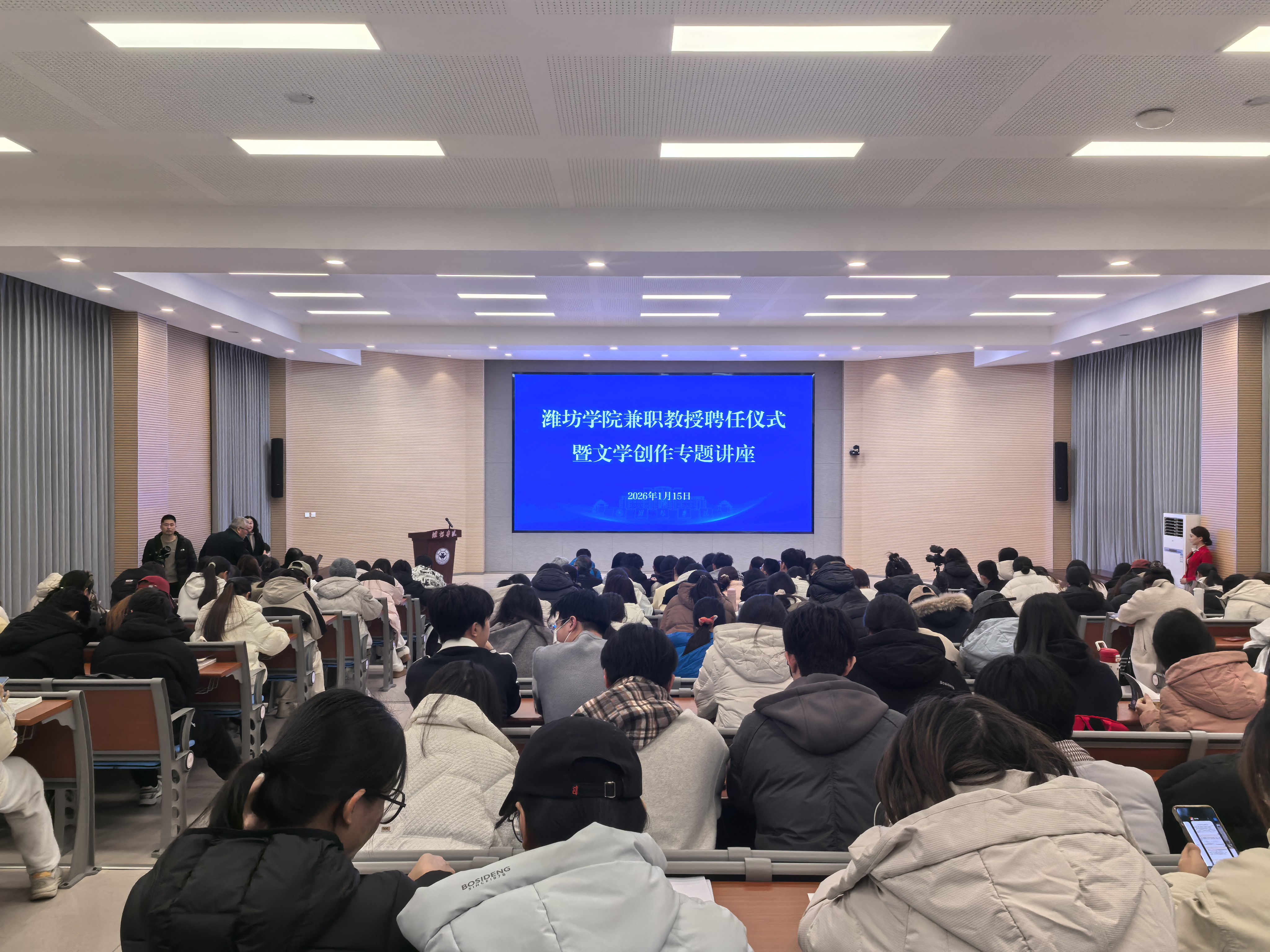 在全市上下深入学习贯彻党的二十届四中全会精神之际,为贯彻落实潍坊市委、市政府强化校地合作、深化双向赋能的部署要求,“潍坊学院兼职教授聘任仪式暨文学创作专题讲座”在潍坊学院知新楼报告厅举行。据了解,本次活动由潍坊学院、潍坊市委宣传部、潍坊市文学艺术界联合会、潍坊市文化和旅游局联合主办,齐鲁文化(潍坊)生态保护区服务中心与潍坊学院文史学院共同承办。