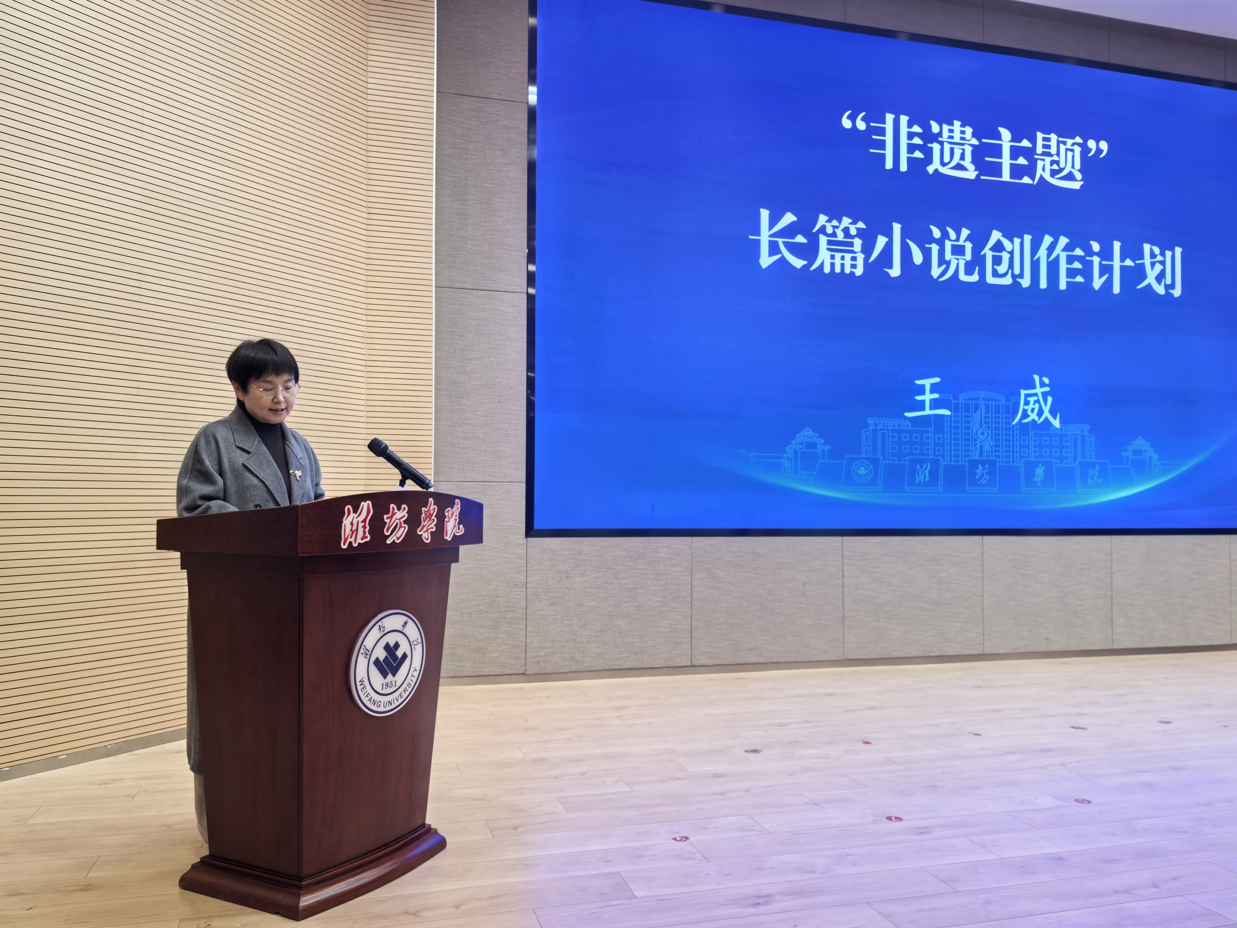 1月15日下午,“潍坊学院兼职教授聘任仪式暨文学创作专题讲座”在潍坊学院举行。聘任仪式上,潍坊学院校长王霞为王威、黄鑫两位作家颁发了聘书。聘任仪式后,王威向潍坊学院图书馆捐赠个人作品。随后,两位教授相继发布创作计划——王威启动“非遗主题”长篇小说创作,黄鑫推出“东风暖”系列长篇小说创作,均立足潍坊文化资源,讲述具有地域特色的时代故事。