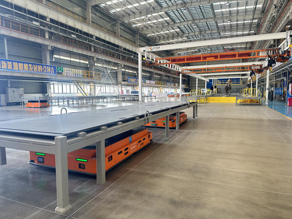 Inside the Shandong Xinneng Shipbuilding workshop in Jining, Shandong province, an automated guided vehicle steadily transports steel plates toward the next stage of production. [Photo by Zhao Ruixue/chinadaily.com.cn]