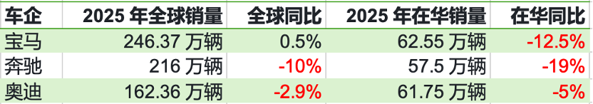近日,传统豪华车三强BBA(奔驰、宝马、奥迪)先后发布了2025年全球销量数据。数据显示,奔驰和奥迪去年全球销量均有明显下滑,仅宝马微增0.5%。