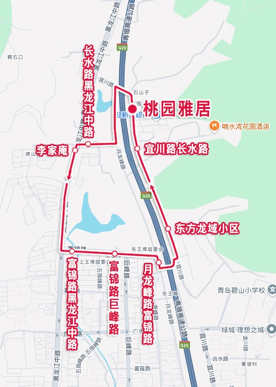自“桃园雅居”始发站,沿宜川路、无名路、长水路、黑龙江中路、富锦路、月龙峰路、宜川路至“桃园雅居”车站止。