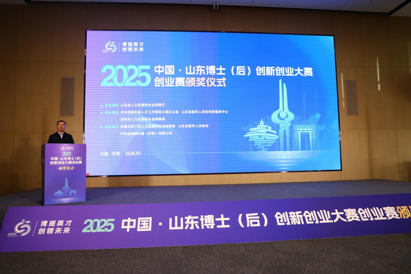 2026年1月15日,2025年中国·山东博士(后)创新创业大赛创业赛决赛颁奖仪式在山东省留学人才之家举办。省人力资源社会保障厅党组书记、厅长张涛出席活动并致辞。山东大学党委常委、常务副校长吴臻,省人力资源社会保障厅党组成员、副厅长、一级巡视员周春艳,济南市政协副主席姜明出席活动。