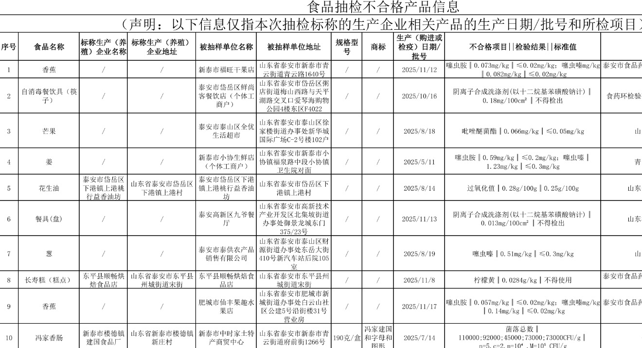 根据《中华人民共和国食品安全法》及其实施条例等有关规定和泰安市食品安全监督抽检计划安排,为进一步保障食品安全,泰安市市场监督管理局对蔬菜制品、糕点、速冻食品、粮食加工品、餐饮食品、食用油、油脂及其制品、食用农产品7个食品大类384批次样品进行了监督抽检,其中合格产品374批次,不合格产品10批次。具体情况见附件。