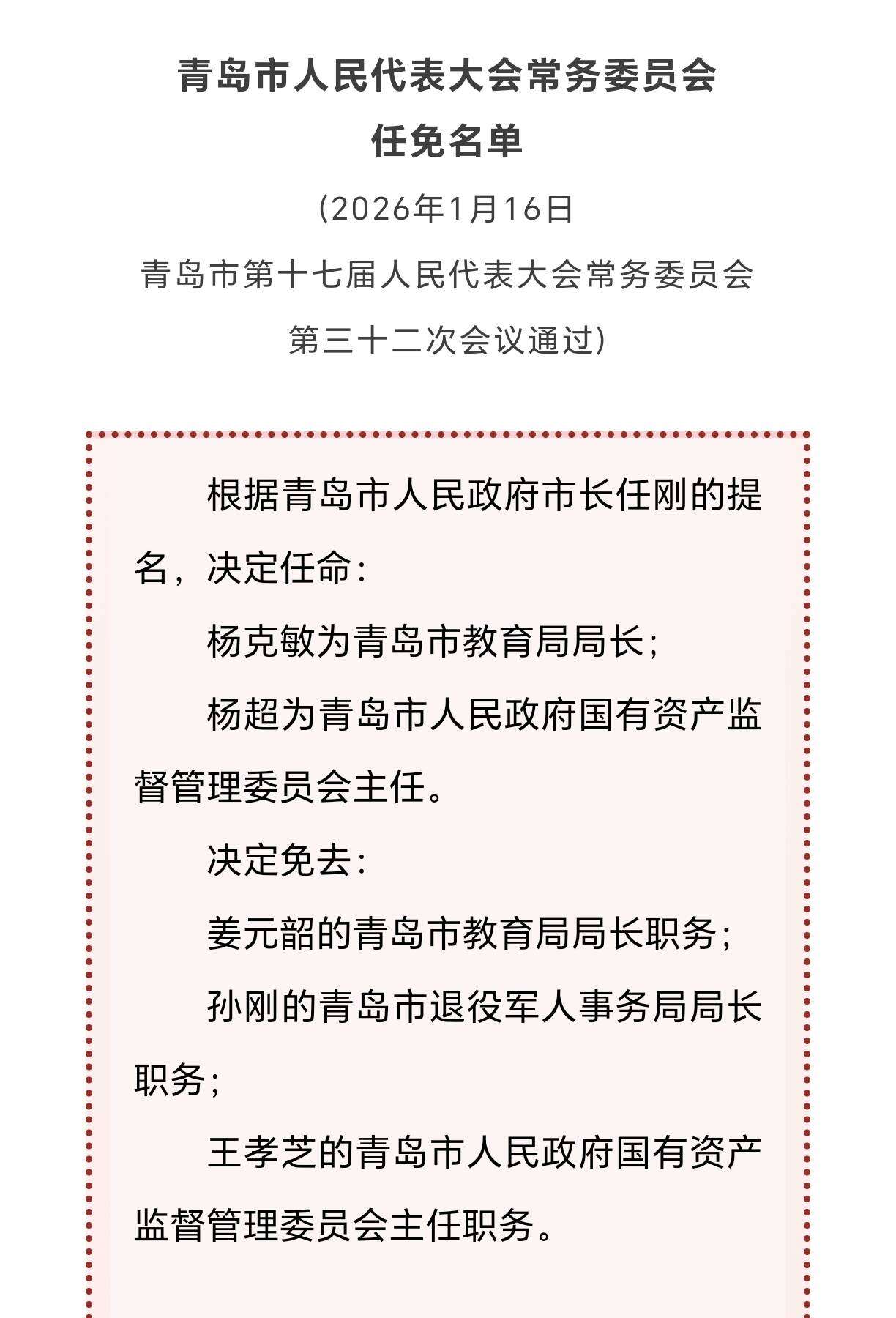 根据青岛市人民政府市长任刚的提名,决定任命:杨克敏为青岛市教育局局长;杨超为青岛市人民政府国有资产监督管理委员会主任。决定免去:姜元韶的青岛市教育局局长职务;孙刚的青岛市退役军人事务局局长职务;王孝芝的青岛市人民政府国有资产监督管理委员会主任职务。