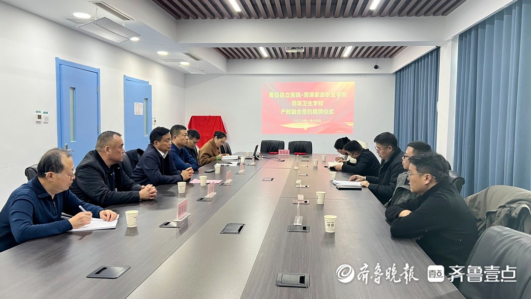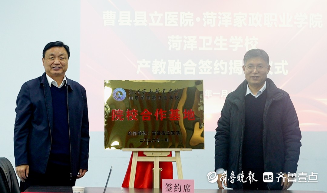 现场,双方共同签署了《菏泽家政职业学院、菏泽卫生学校与曹县县立医院产教融合合作方案》,并为“菏泽家政职业学院 菏泽卫生学校院校合作基地”揭牌,标志着校地院三方合作迈向新阶段。