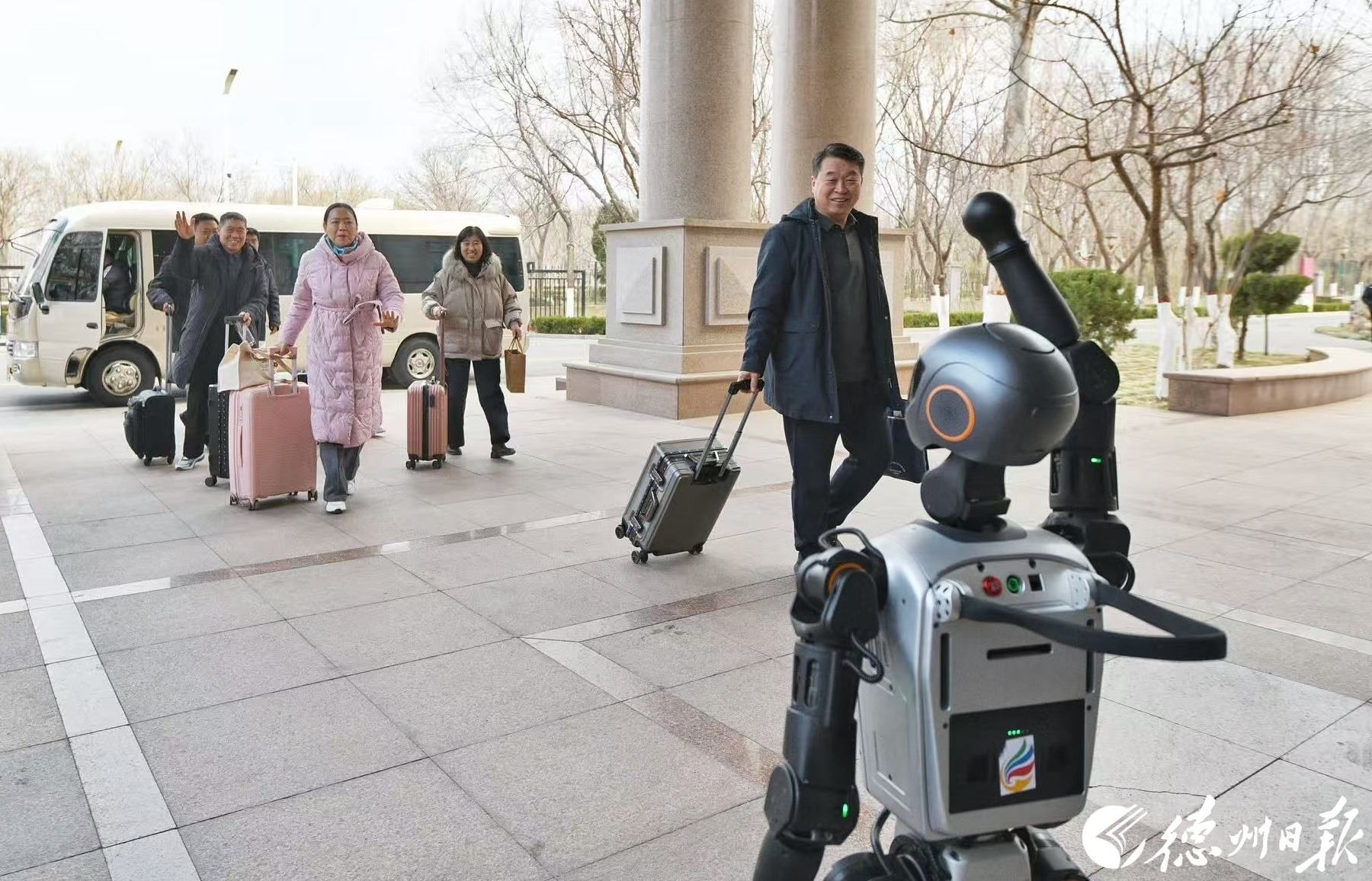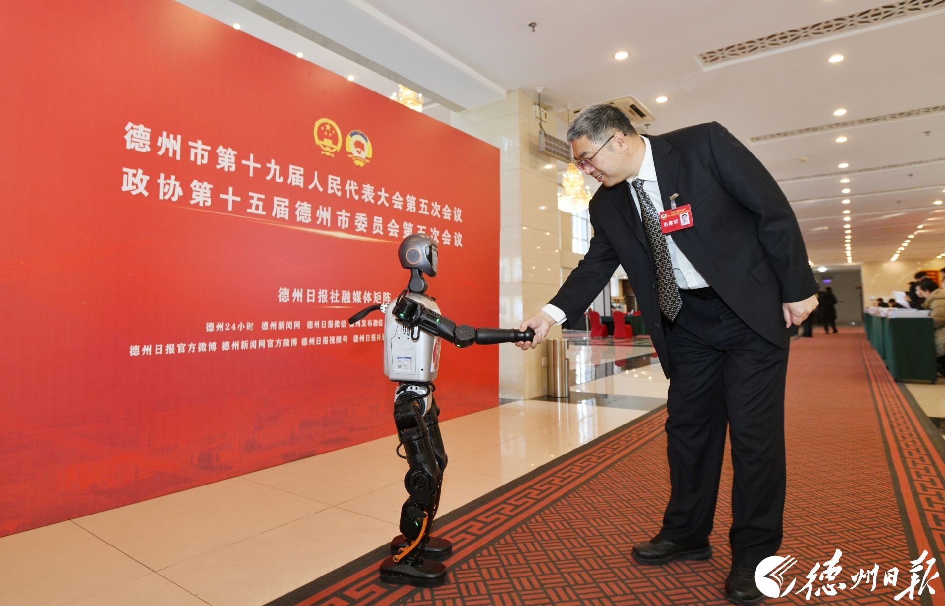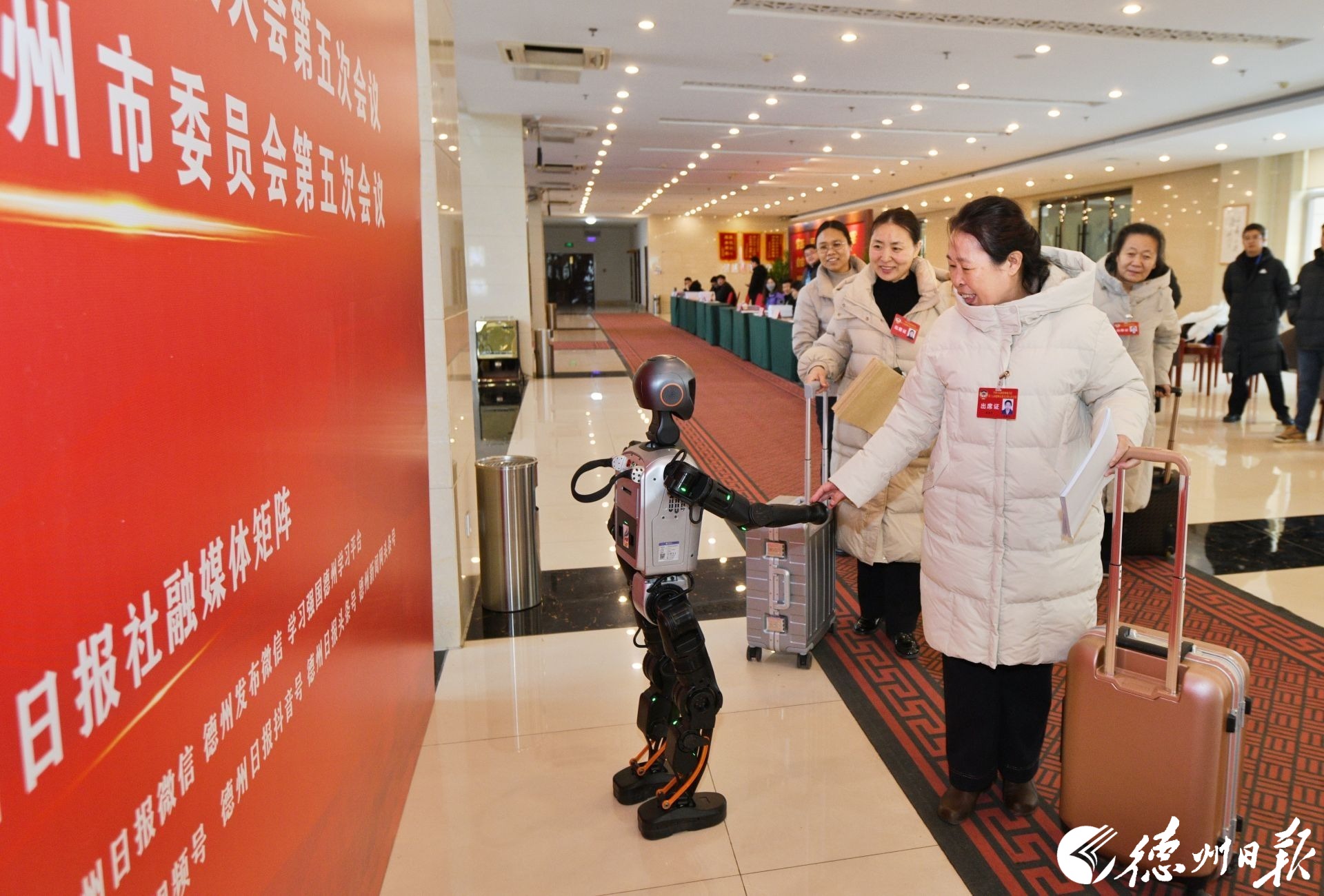 1月17日,出席市政协十五届五次会议的委员陆续抵达驻地,向大会报到。现场,德州日报机器人记者“小创”和委员们积极互动。