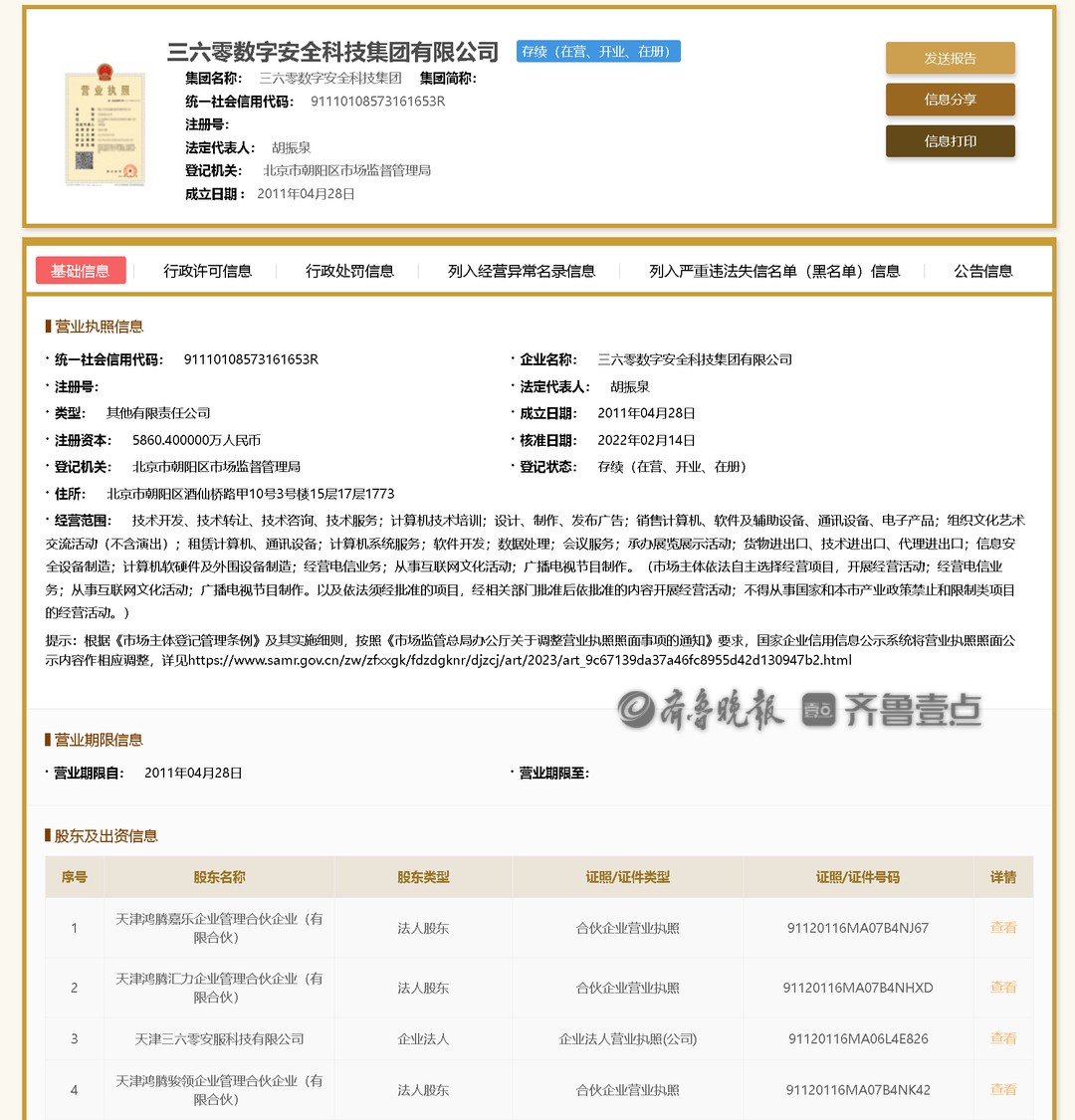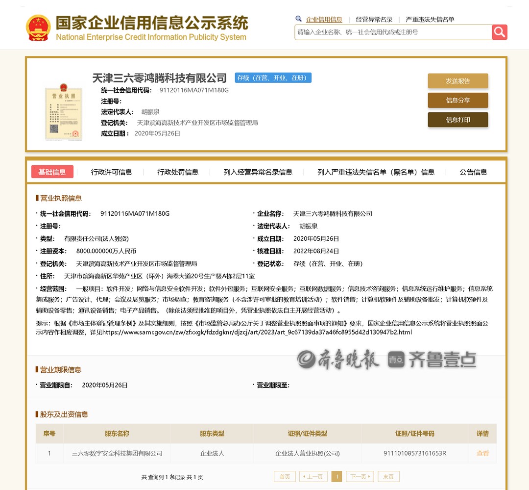 公开信息显示,天津三六零鸿腾科技有限公司成立于2020年5月26日,法定代表人胡振泉,股东为三六零数字安全科技集团有限公司。后者大股东为天津三六零安服科技有限公司,以上企业均为三六零安全科技股份有限公司(三六零 601360)旗下公司。