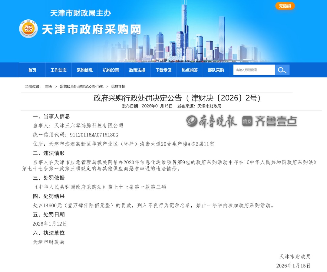 近日,天津市财政局发布政府采购行政处罚决定公告( 津财决〔2026〕2号)。