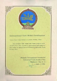 (乌兰巴托国际食品博览会金奖证书)