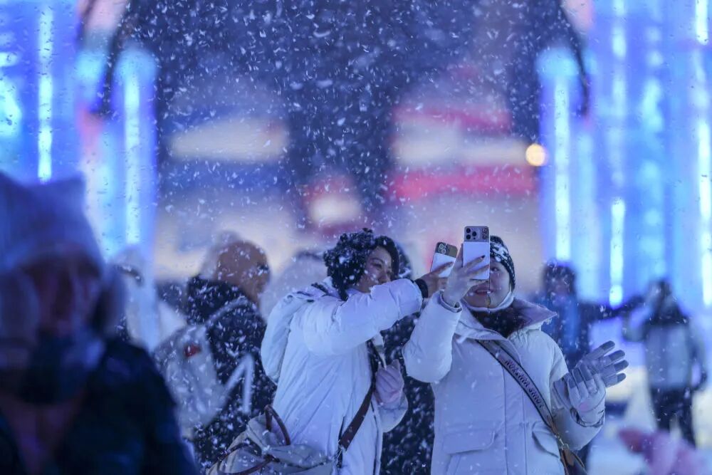 1月13日,游客在哈尔滨冰雪大世界园区外的“雪人一家人”附近游玩拍照。新华社记者 王建威 摄