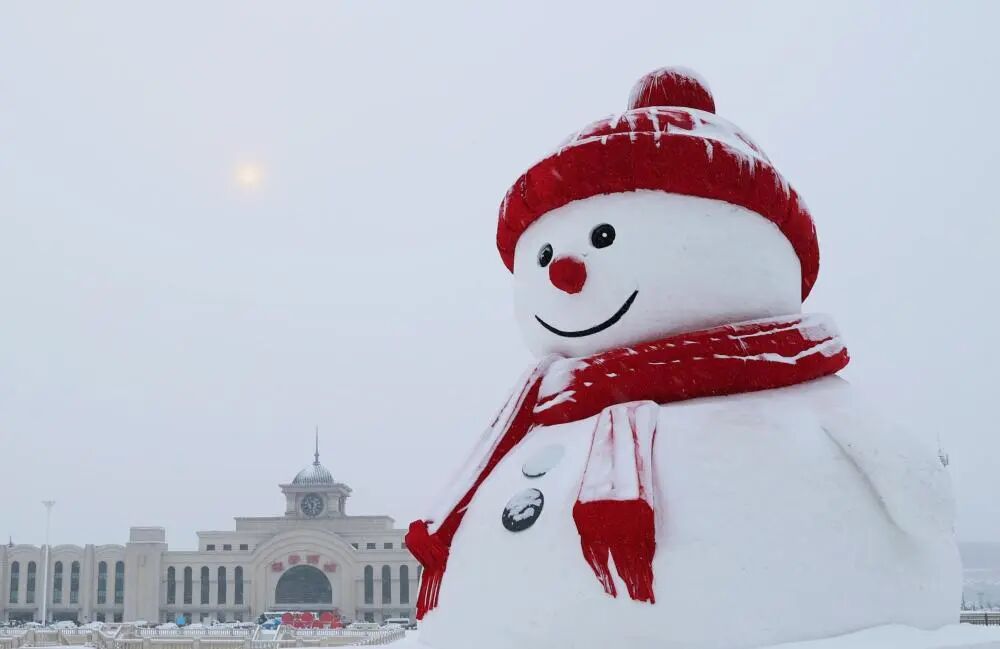 1月10日在黑龙江省绥芬河火车站站前拍摄的大雪人。新华社发(曲艺伟摄)