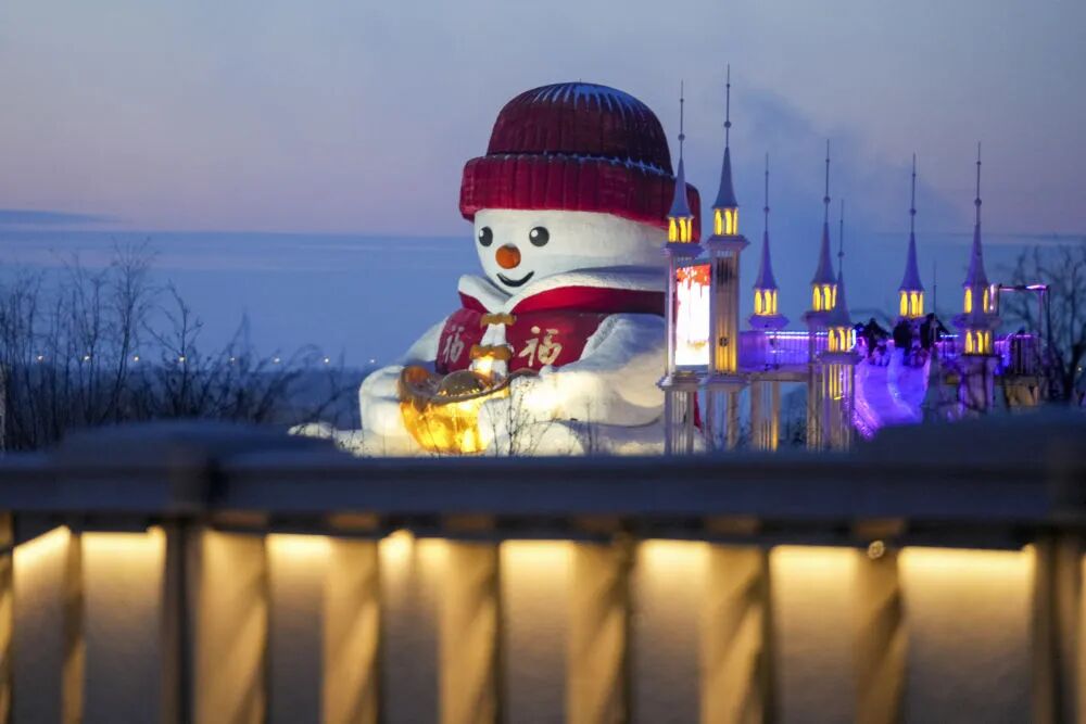 1月13日,游客在哈尔滨冰雪大世界园区的“雪人一家人”附近游玩拍照。新华社记者 王建威 摄