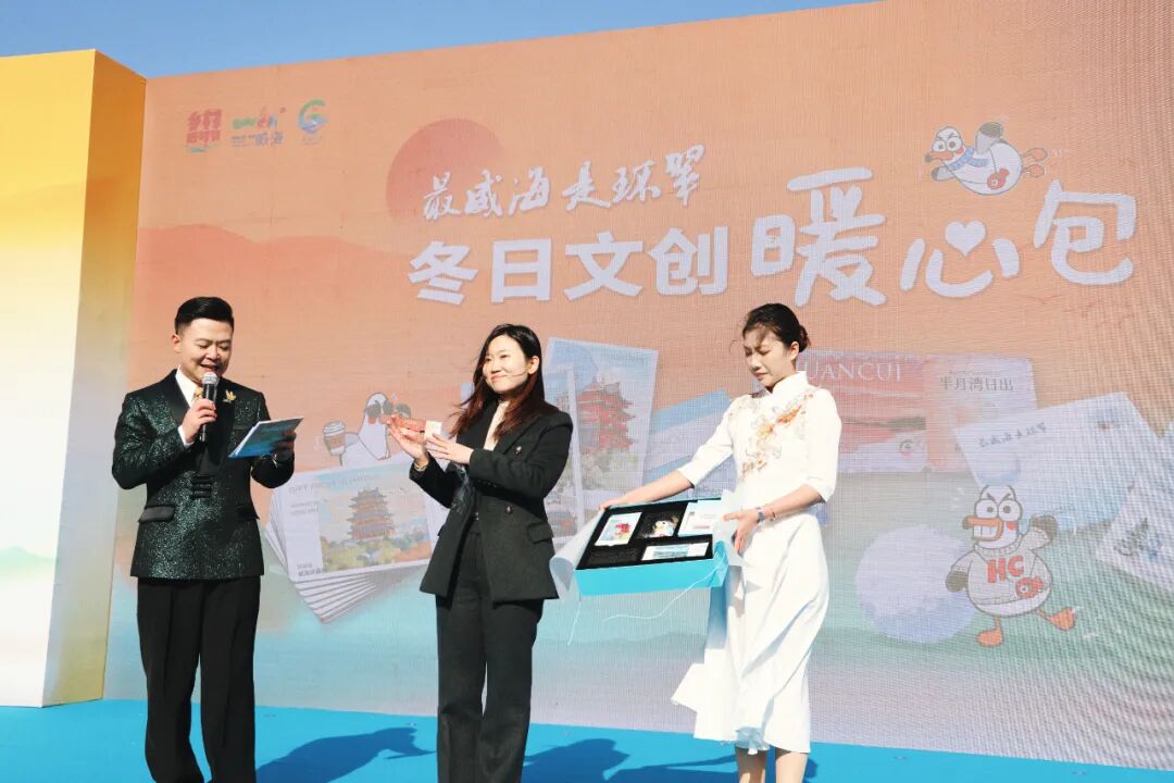 其中,“最威海是环翠”冬日文创暖心包的亮相引发全场关注。环翠区文旅局党组成员、副局长贾依琳介绍,暖心包既有丑萌可爱的“鸥K”玩偶,也有灵动的冬游冰箱贴、可互动的追光明信片,以及一张浓缩了半月湾日出美景的追光船票,还附赠五重冬游礼:从“吃住玩”畅游华夏城,到“吃住拍”留住半月湾;从治愈系旅拍“雪舞猫头山”,到50元海陆双通票,再到邂逅北纬37°的艺术浪漫……让游客深度感受“最威海是环翠”的魅力和温情。