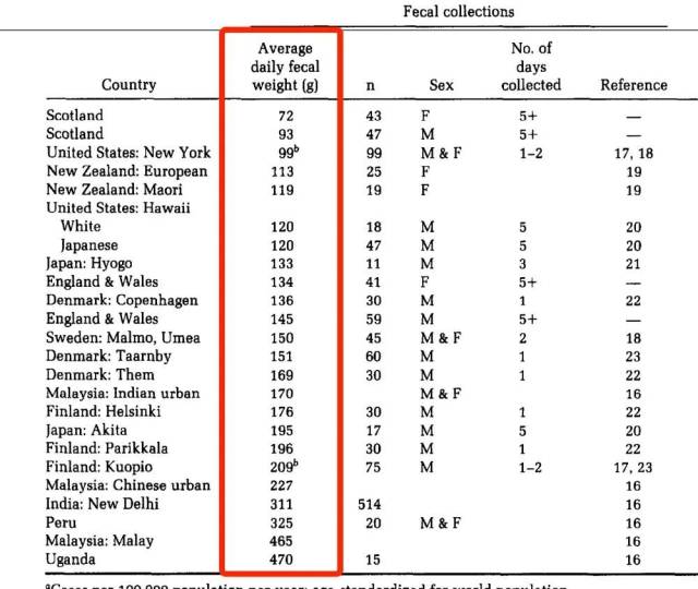 1992年发表在《肠胃病学》(GASTROENTEROLOGY)上的一项研究就统计了世界很多个地区人群的粪便与肠癌之间的关联,其中的粪便平均重量恰好可以给我们做个参考。