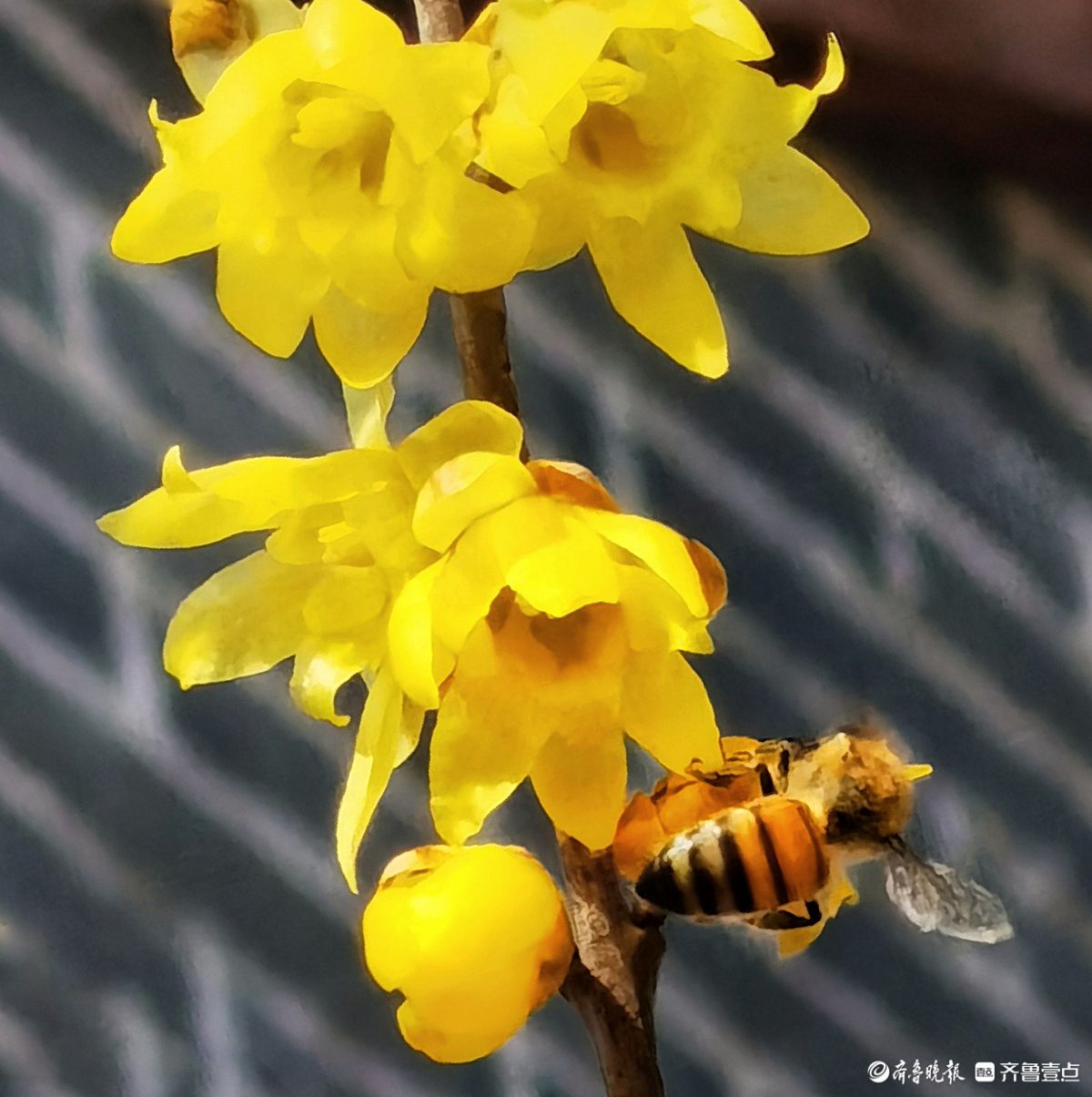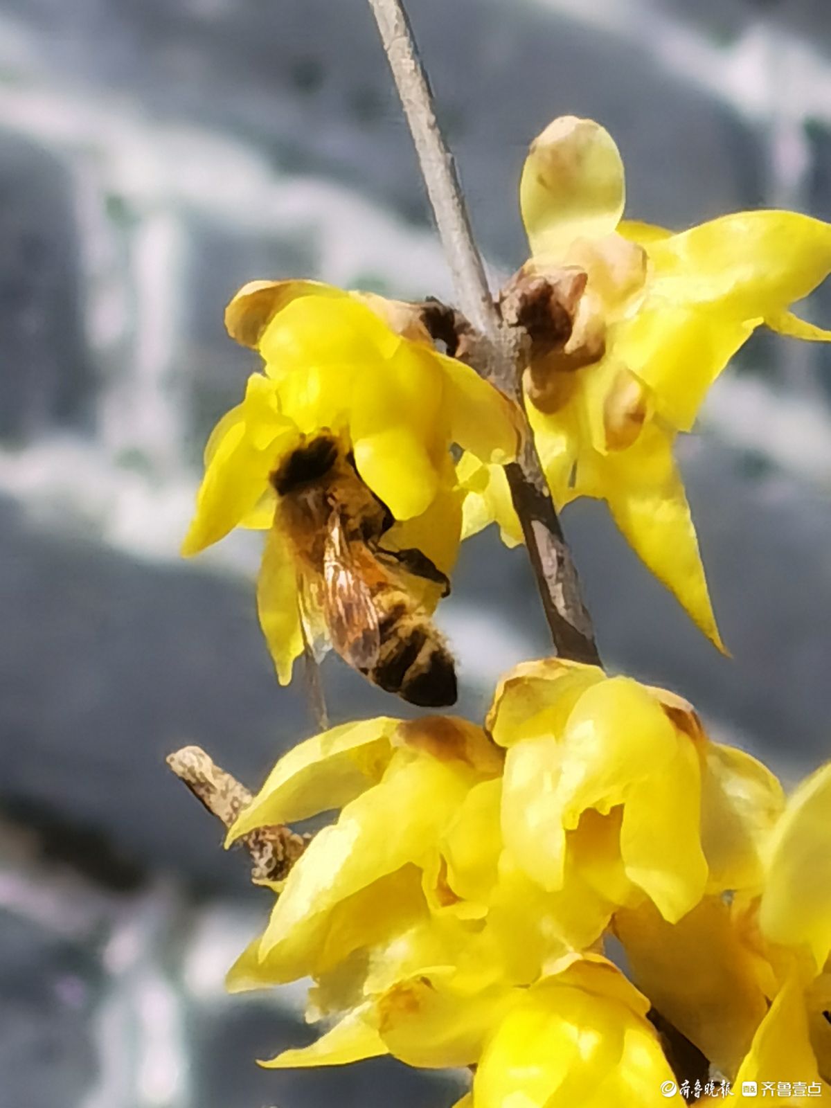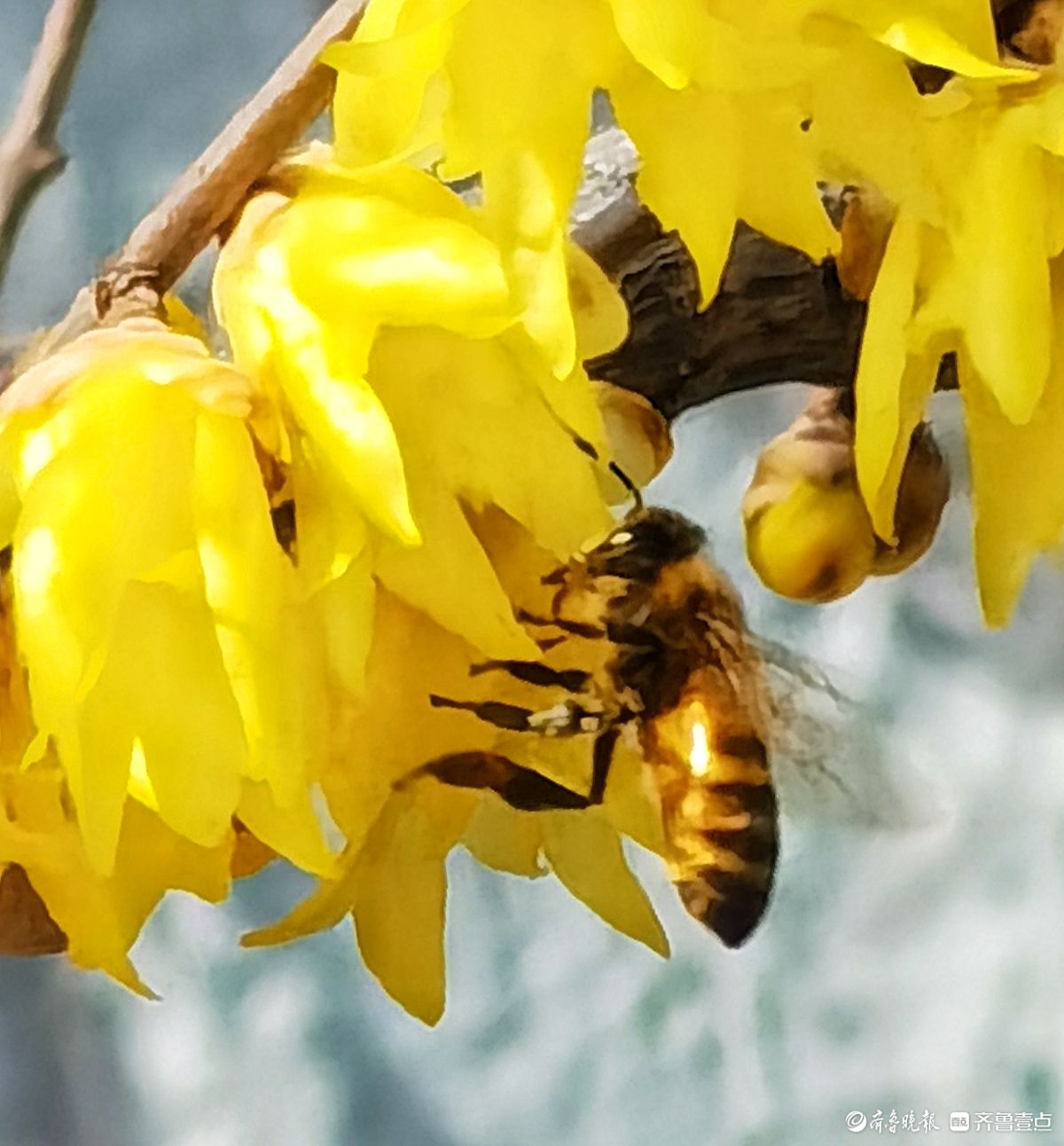 晴日里的药山公园暖意融融,腊梅花开得正盛,金黄花瓣缀满枝头,清冽香气四处弥漫。成群的小蜜蜂循香而来,在花丛中上下翻飞嗡嗡鸣唱,为这冬日景致添了无限生机。于聪玲摄