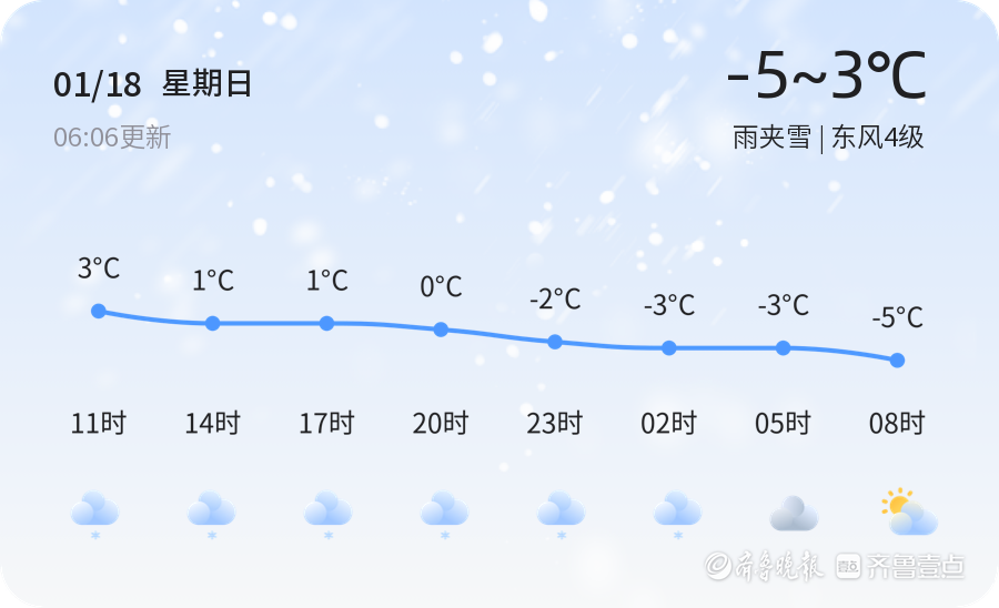 今天是1月18日,星期日,农历十一月三十。日照市迎来雨夹雪天气,气温在-5℃到3℃之间,东风4级,空气湿度85%,空气质量状况为良好。市民出行请注意保暖,防范道路湿滑,建议携带雨具,谨慎驾驶,确保行车安全。