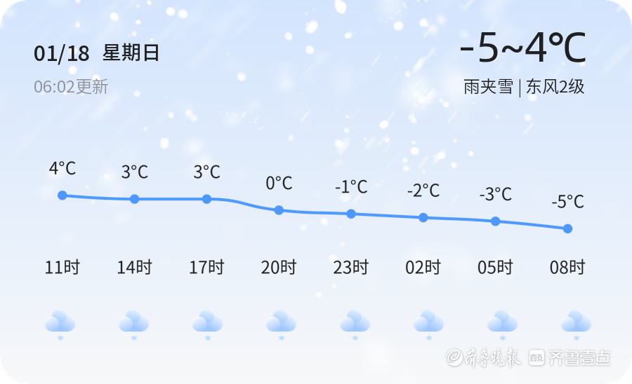 今天是1月18日,星期日,农历十一月三十。枣庄市迎来雨夹雪天气,气温为-5℃到4℃,东风2级,空气湿度93%。空气质量方面,PM2.5指数为49,属于良好水平。市民出行时请注意防寒保暖,雨雪天气道路湿滑,建议减速慢行,确保行车安全。
