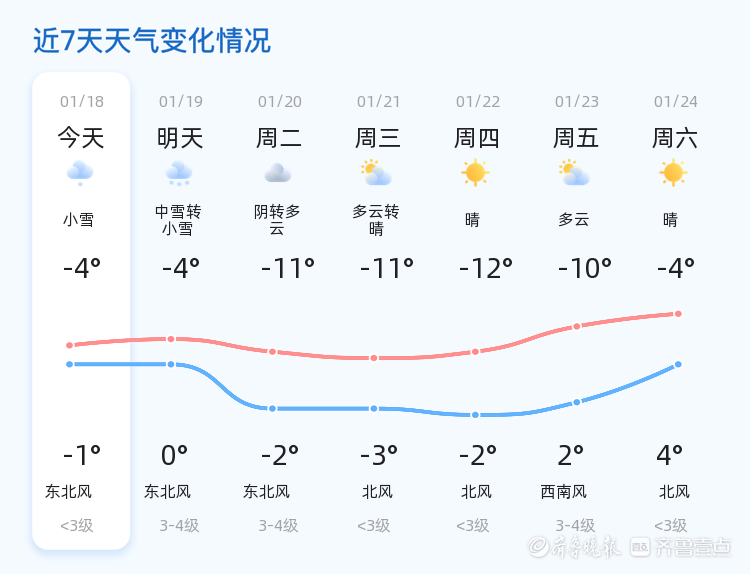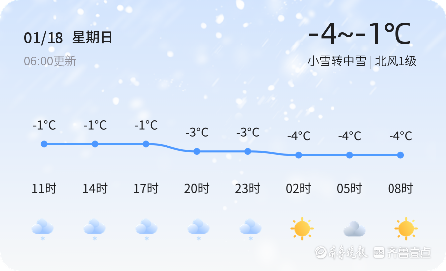 今天是2026年1月18日,星期日,农历十一月三十。济南迎来新一轮降雪天气,气温较低。今天济南各区普遍出现小雪转中雪的天气,气温在-4℃到-1℃之间,北风1级,空气湿度高达93%,PM2.5指数为58,空气质量良好。市民出行需注意保暖和交通安全。