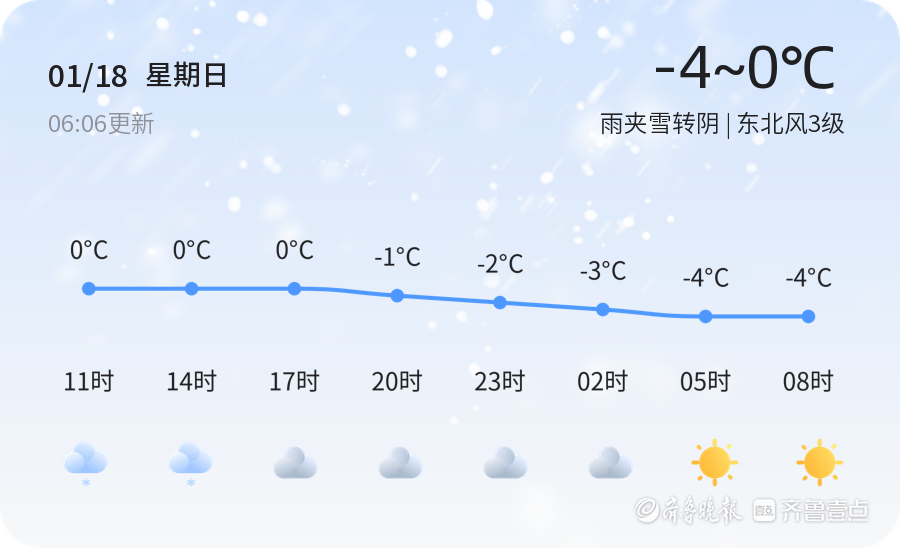 今天是2026年1月18日,农历十一月三十,星期日。威海市今日天气为雨夹雪转阴,气温范围在-4℃至0℃之间,东北风3级,空气湿度56%,空气质量为优。市民出行请注意携带雨具,做好防寒保暖措施,尤其是老人和儿童需格外注意保暖。今天的天气状况可能对交通造成一定影响,请市民出行时提前规划路线,保持安全车距,减速慢行。