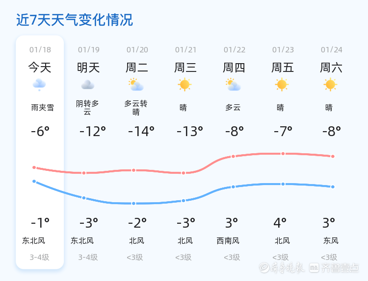 明天(1月19日)的天气将有所变化,预计为阴转多云,气温将进一步下降,最低气温可达-12℃,最高气温为-3℃。与今天相比,明天的天气状况将由雨夹雪转为阴转多云,风力维持在3-4级东北风。