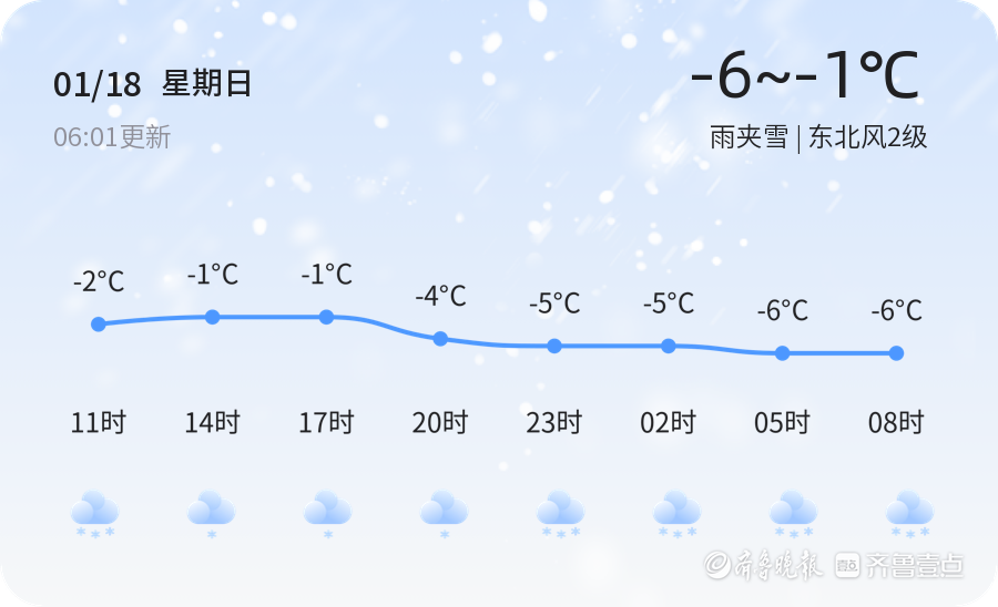今天是2026年1月18日,农历十一月三十,淄博市迎来了一次雨夹雪天气。今日气温较低,最高气温为-1℃,最低气温为-6℃,东北风2级,空气湿度为86%,PM2.5指数为64。各区的天气情况基本一致,均出现雨夹雪,气温较为寒冷。