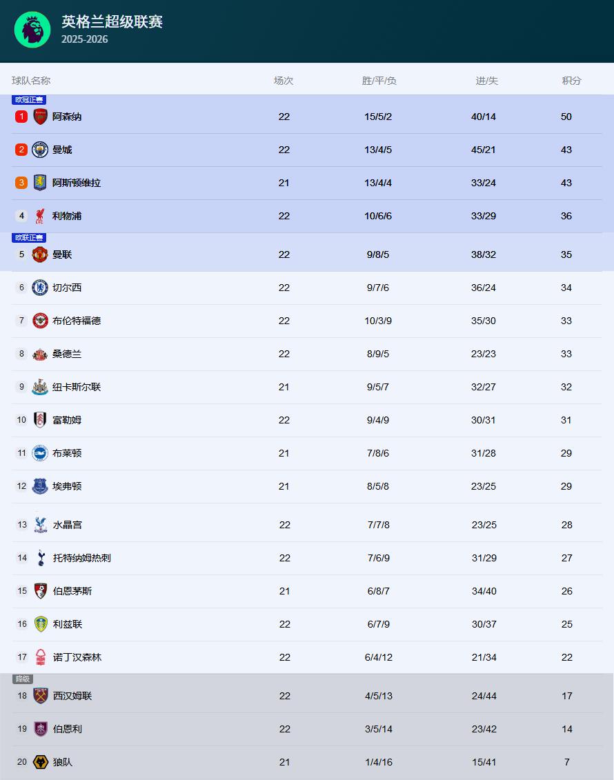 英超第22轮继续进行,多支球队完成了自己的第22轮比赛。英超积分榜排名前两位的阿森纳和曼城分别取得一平一负的战绩。其中,阿森纳客场0-0战平诺丁汉森林,曼市德比曼联2-0复仇曼城,最终,阿森纳以7分优势领跑英超积分榜。