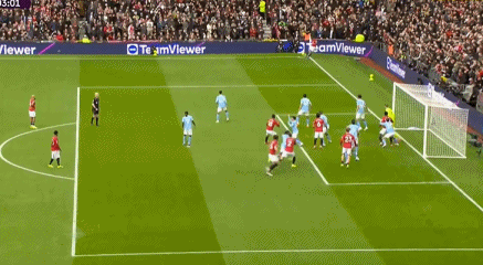 第4分钟,曼联球员多尔古左路低平球传中,胡桑诺夫关键解围,随后B费开出角球,马奎尔近距离头球攻门击中横梁弹出,曼城逃过一劫。