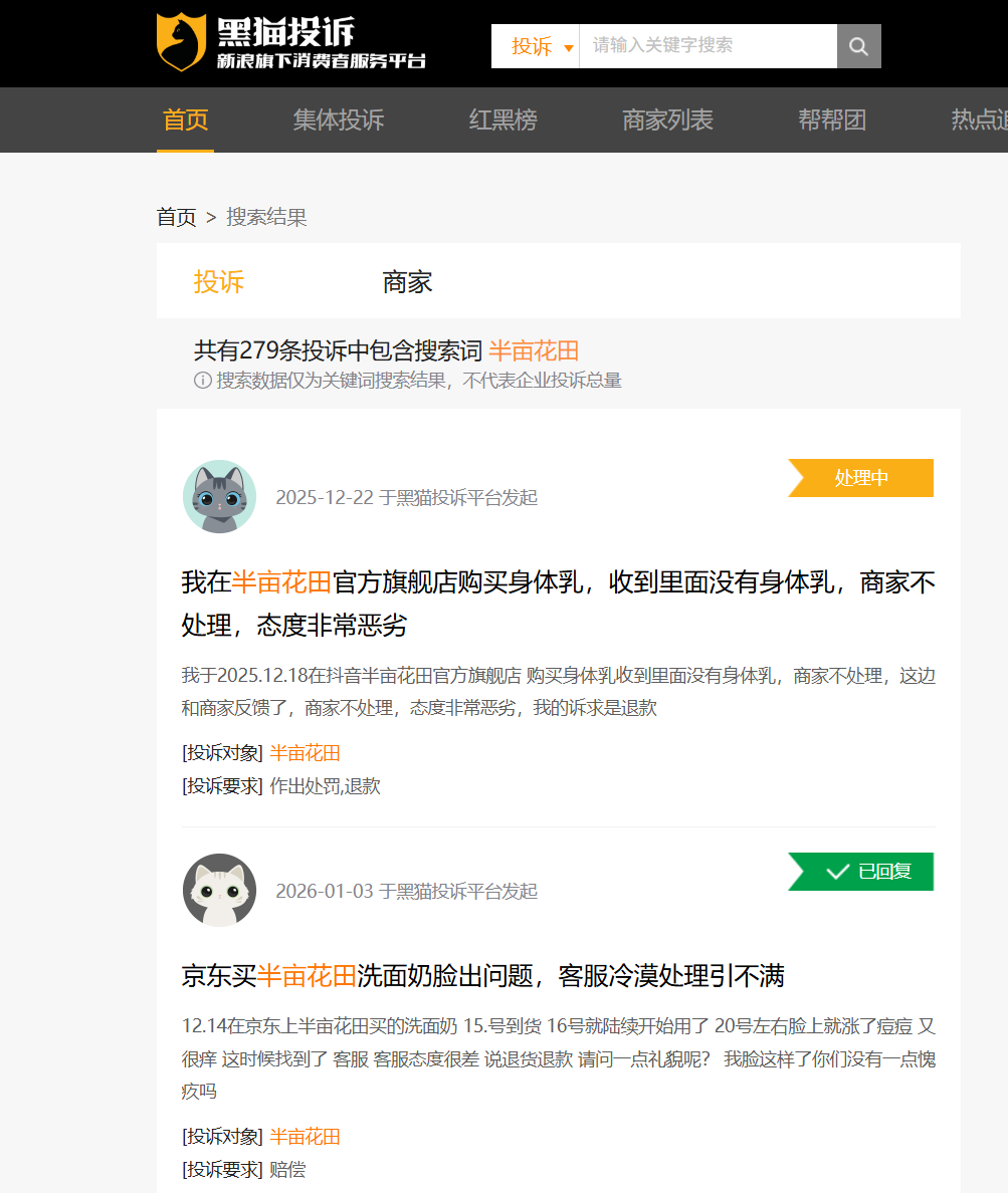 此外,在黑猫投诉平台,共有279条投诉(搜索数据仅为关键词搜索结果,不代表企业投诉总量)包含“半亩花田”关键词,多指向产品质量、售后服务等问题。其中,有消费者表示,在使用半亩花田洗面奶后脸上长了痘痘;还有消费者使用了半亩花田的水和乳后脸上出现了红斑等。