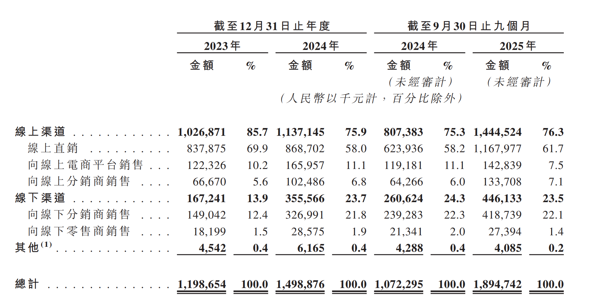 2023年、2024年及2025年前9个月,半亩花田来自线上渠道的销售收入分别为10.27亿元、11.37亿元和14.45亿元,占同期总收入的85.7%、75.9%和76%。