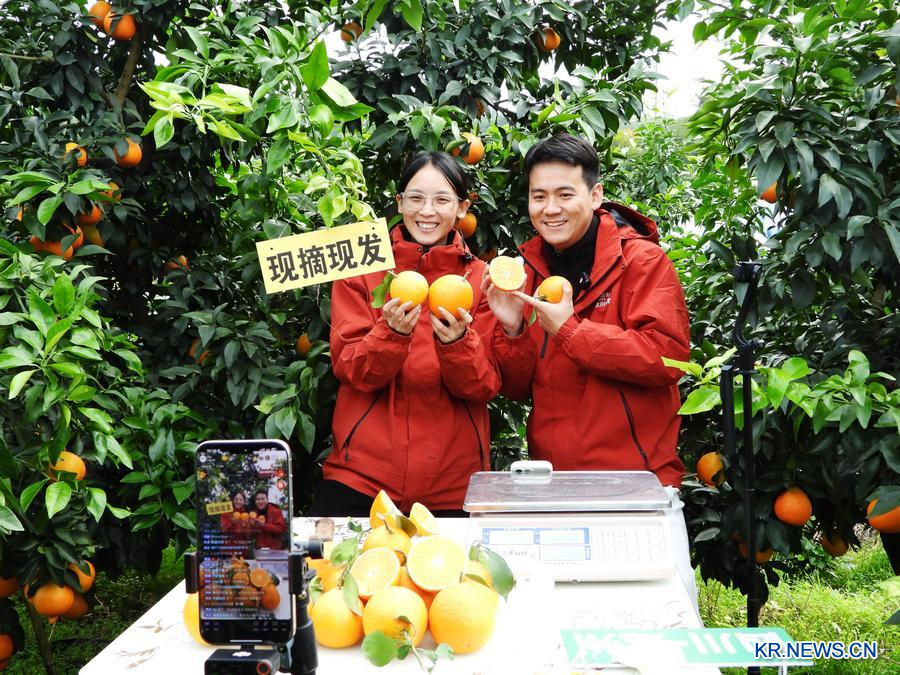 2025년 11월 18일 쓰촨(四川)성 다저우(達州)시 취(渠)현에 위치한 감귤 재배 기지에서 라이브커머스로 네이블오렌지를 판매 중인 관계자. (사진/신화통신)