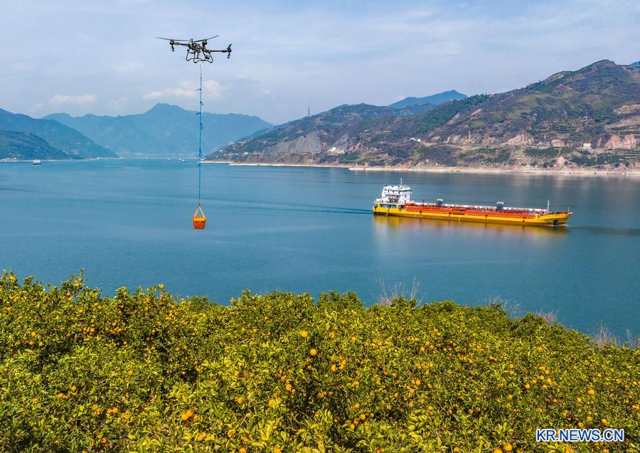 2025년 3월 17일 후베이(湖北)성 이창(宜昌)시 쯔구이(秭歸)현의 한 마을 주민들이 드론으로 네이블오렌지를 운반하는 모습을 드론 사진에 담았다. (사진/신화통신)
