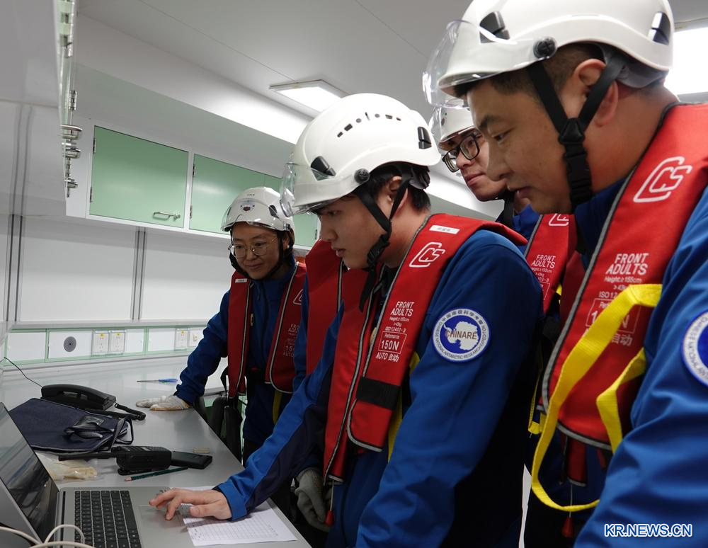16일 중국 극지 과학탐사 쇄빙선 '쉐룽(雪龍)호' 대양조사팀 대원들이 실험실에서 낙하식 수온·염분·수심 관측장치(XCTD)가 보내온 데이터를 살펴보고 있다.