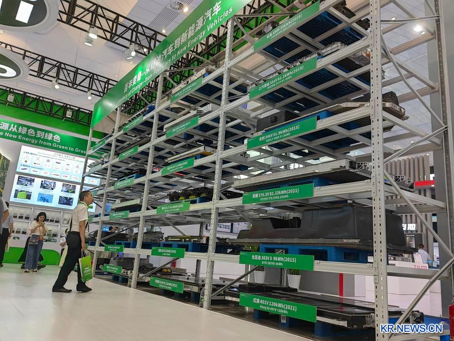 지난 2023년 6월 9일 '2023 세계동력배터리대회'에서 한 기업이 전시한 재활용된 신에너지차 동력 배터리. (사진/신화통신)