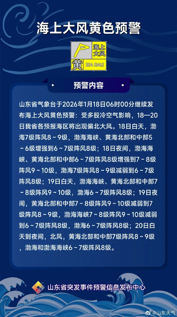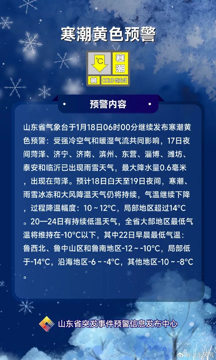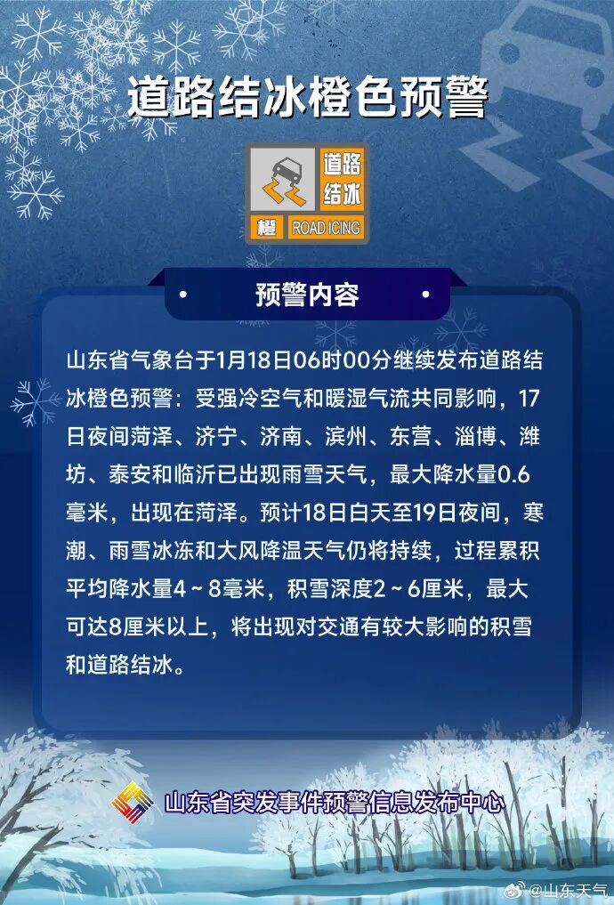 1月18日6时,山东省气象台发布低温黄色预警、寒潮黄色预警、暴雪蓝色预警、道路结冰橙色预警、