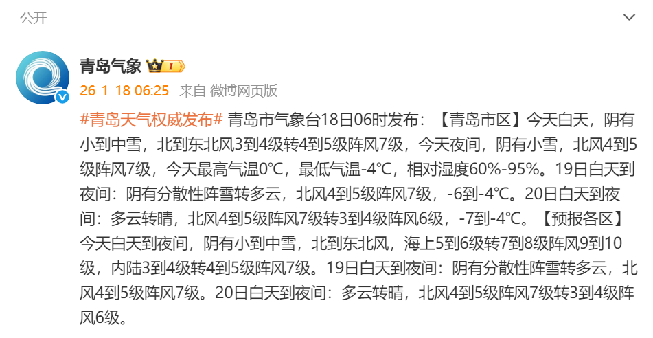 【青岛市区】今天白天,阴有小到中雪,北到东北风3到4级转4到5级阵风7级,今天夜间,阴有小雪,北风4到5级阵风7级,今天最高气温0℃,最低气温-4℃,相对湿度60%-95%。