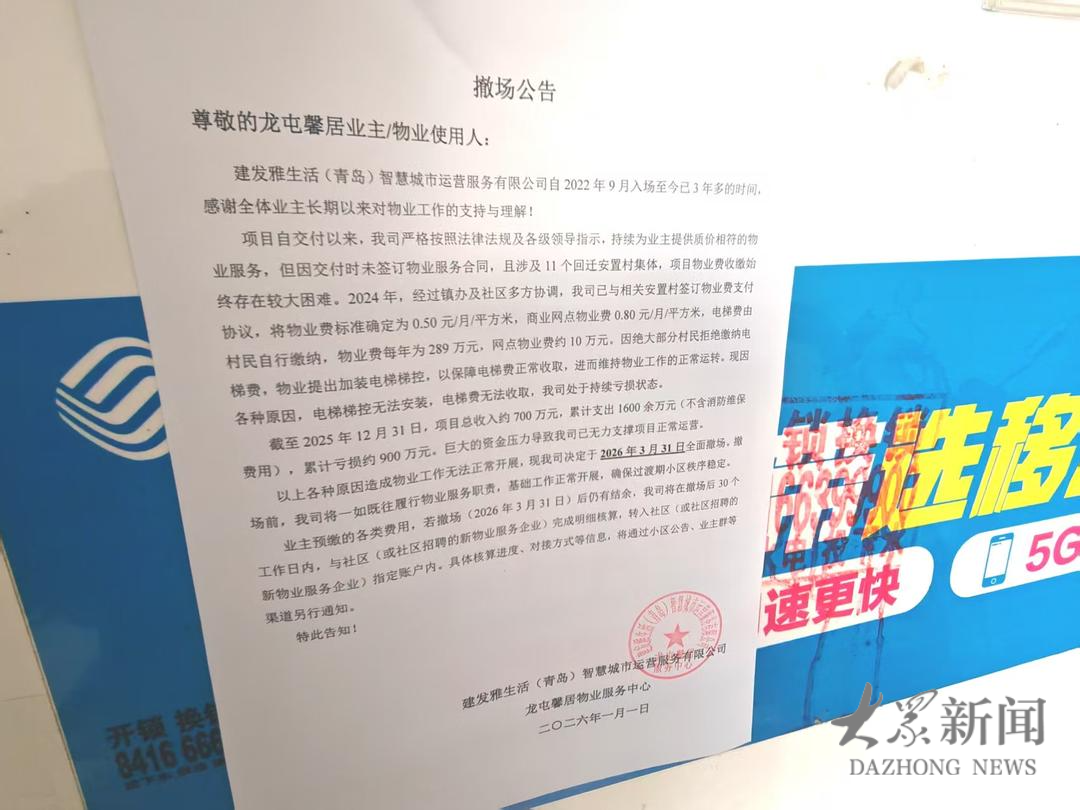 当天,记者联系了龙屯社区居委会,工作人员表示上报领导后答复此事,但截至记者发稿前未接到答复。记者随后将此事反映给了胶州市相关部门,经证实,小区物业建发雅生活物业公司将于2026年3月31日全面撤离。后续关于小区的物业管理,胶州市李哥庄镇已组织村庄研究相关方案,待11个村庄集体开会通过后,将及时公布。