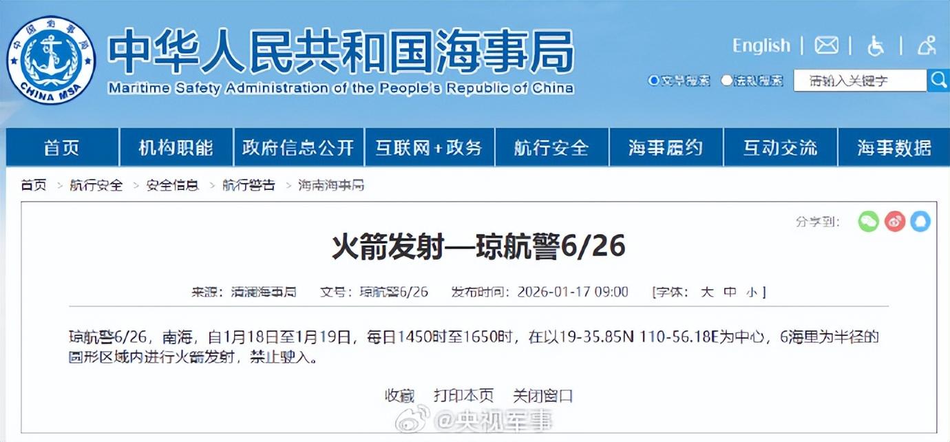 航行警告!南海部分海域有火箭发射,禁止驶入中国海事局网站 2026-01-18 14:08:29据中国海事局网站消息,清澜海事局发布航行警告,自1月18日至1月19日,每日14时50分至16时50分,南海部分海域进行火箭发射,禁止驶入。责任编辑:张春宇