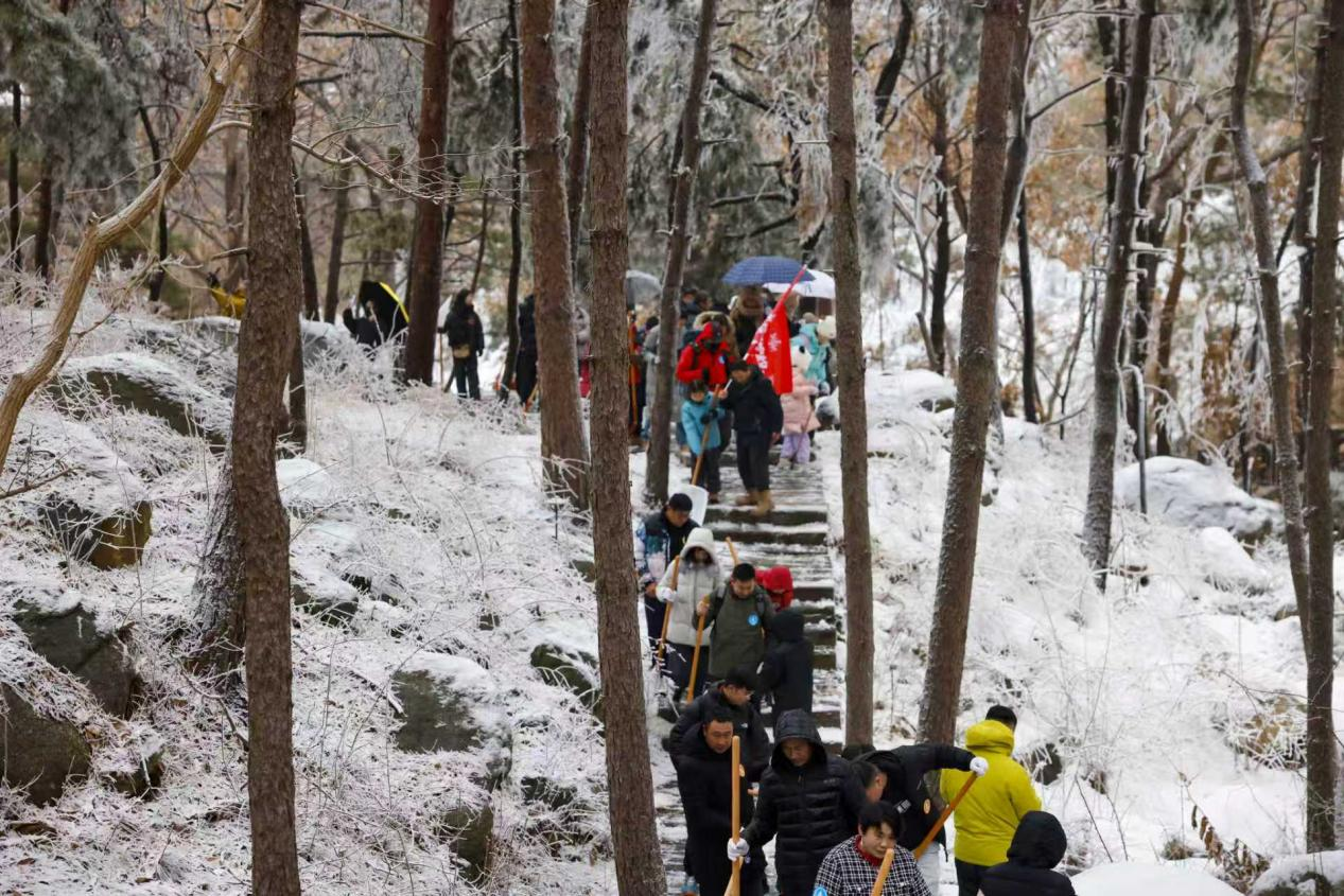 两大景区各展特色,让游客收获满满。龟蒙景区无自然降雪,但游客们热情不减,本着“来都来了”的心态变身“森林守护官”,投身扫树叶、捡垃圾、绿植养护等轻量任务,山间处处是热火朝天的劳作场景。活动结束后,龟蒙景区精心烹制地道沂蒙长寿菜,让游客一口热汤下肚暖意直达心底。云蒙景区开启“宠客模式”,以人造雪打造专属雪世界,细腻白雪覆盖山林,搭配晶莹雾凇,踩上去咯吱作响,氛围感拉满。游客们手持工具协作清扫雪道,重温童年玩雪的快乐,累了便打卡冰雪帐篷、冰瀑,随手拍出电影感大片。