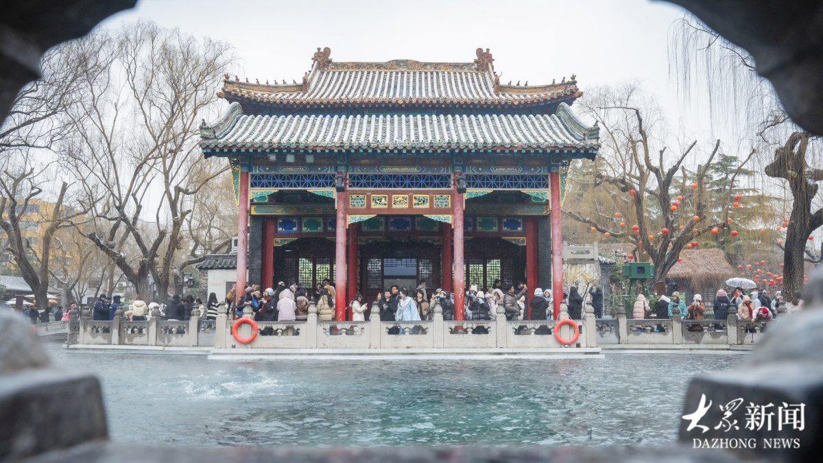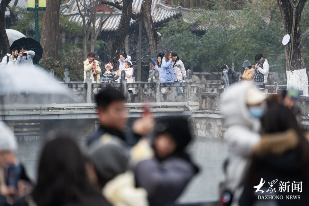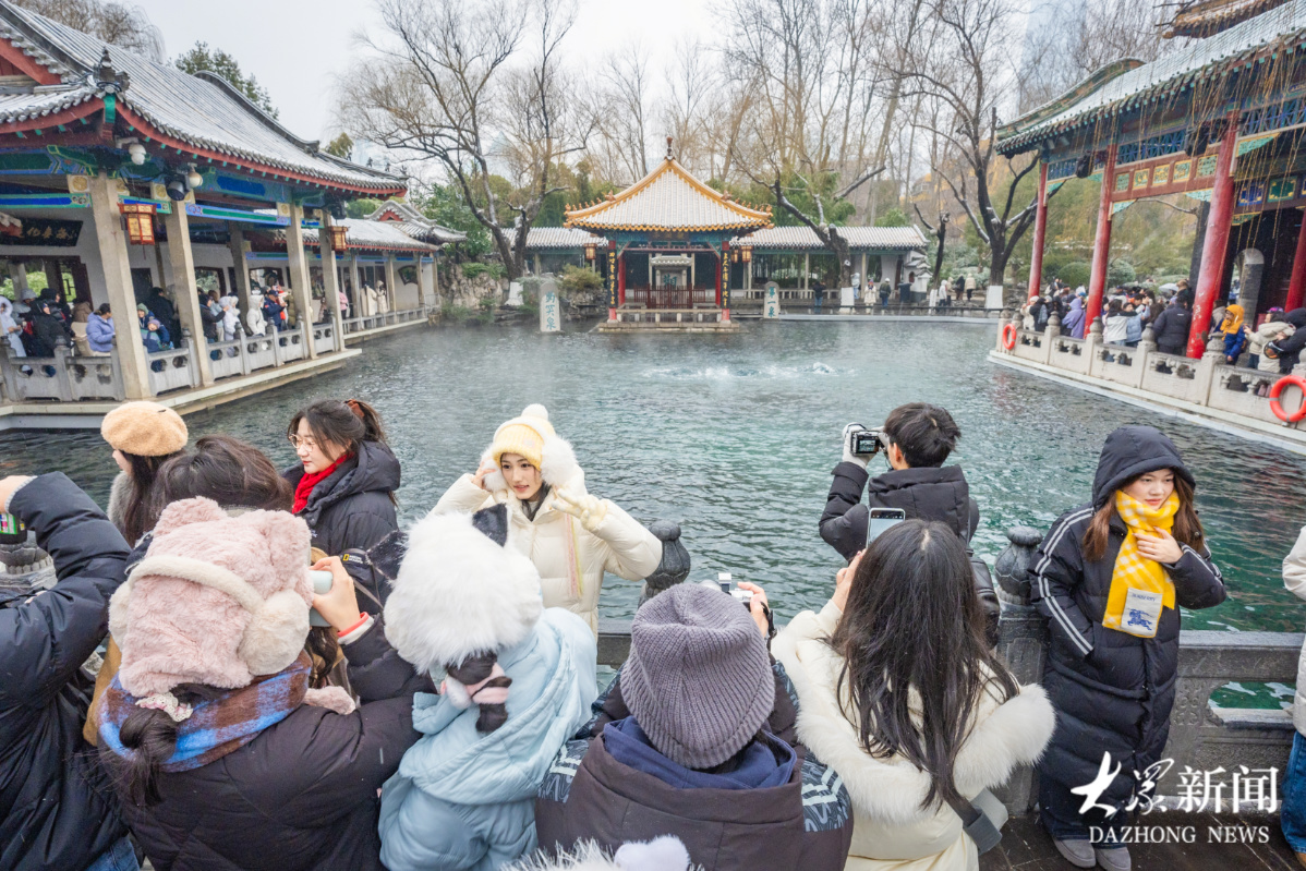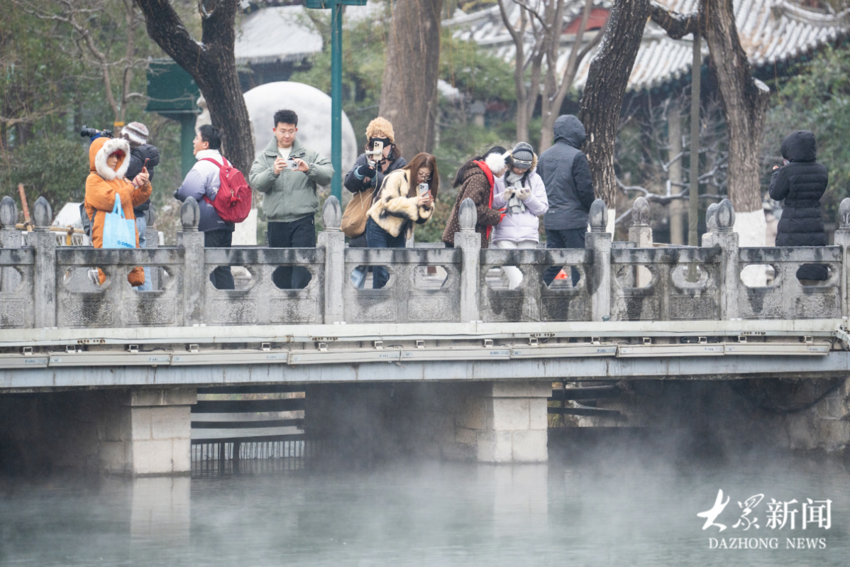 1月18日,济南迎来寒潮天气,气温下降并迎来了2026年首场降雪。记者从中国天气网上了解到,1月15日济南最高气温达到了17℃,18日最高气温则降至-1℃,最低气温仅有-5℃。在济南天下第一泉景区趵突泉公园内,雪花飘落,泉池中升起雾气,“云雾润蒸”奇观的重现吸引了不少游客前来拍照、打卡。(大众新闻记者 毕胜)