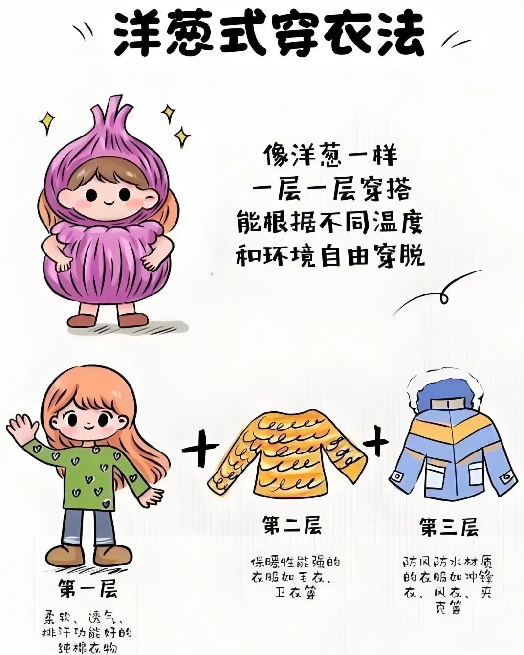 遵循“内薄软、中保暖、外防风”的“洋葱式”多层穿衣法。尤其要注意头、颈、手、脚等部位的保暖。
